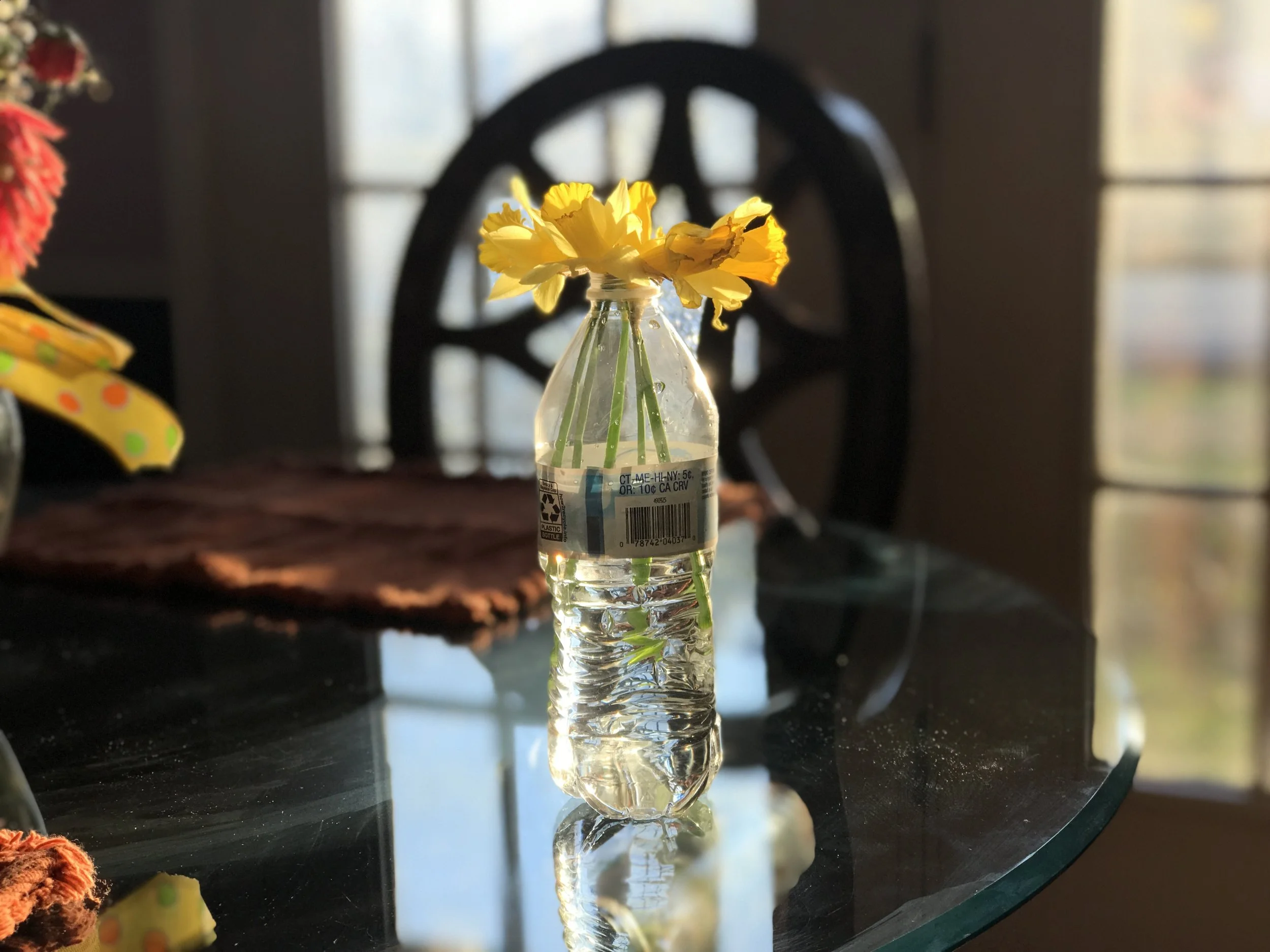 Until this morning. Through the hustle of the morning and getting ready, the girl (that is what we call our two little ones in public, the girl and the boy, lol) found time to find a water bottle and put the flowers inside of it before we left. I never noticed until I came home. I smiled when I saw them. They were so pretty in the light. I didn’t want to move them and I ran to get my phone to take a picture before the light changed. It was precious. It was thoughtful and kind. She knows I love cut flowers, plants and all things beautiful here. Even though, these were a product of a time of disobedience, she still wanted to leave them for me. I’m sure when she picked them, she didn’t think she was doing anything that she wasn’t supposed to be doing. She was just with her brother, enjoying the adventure of nature, and knowing her, she wanted to bring us something pretty. She’s always thinking of us; specifically me.