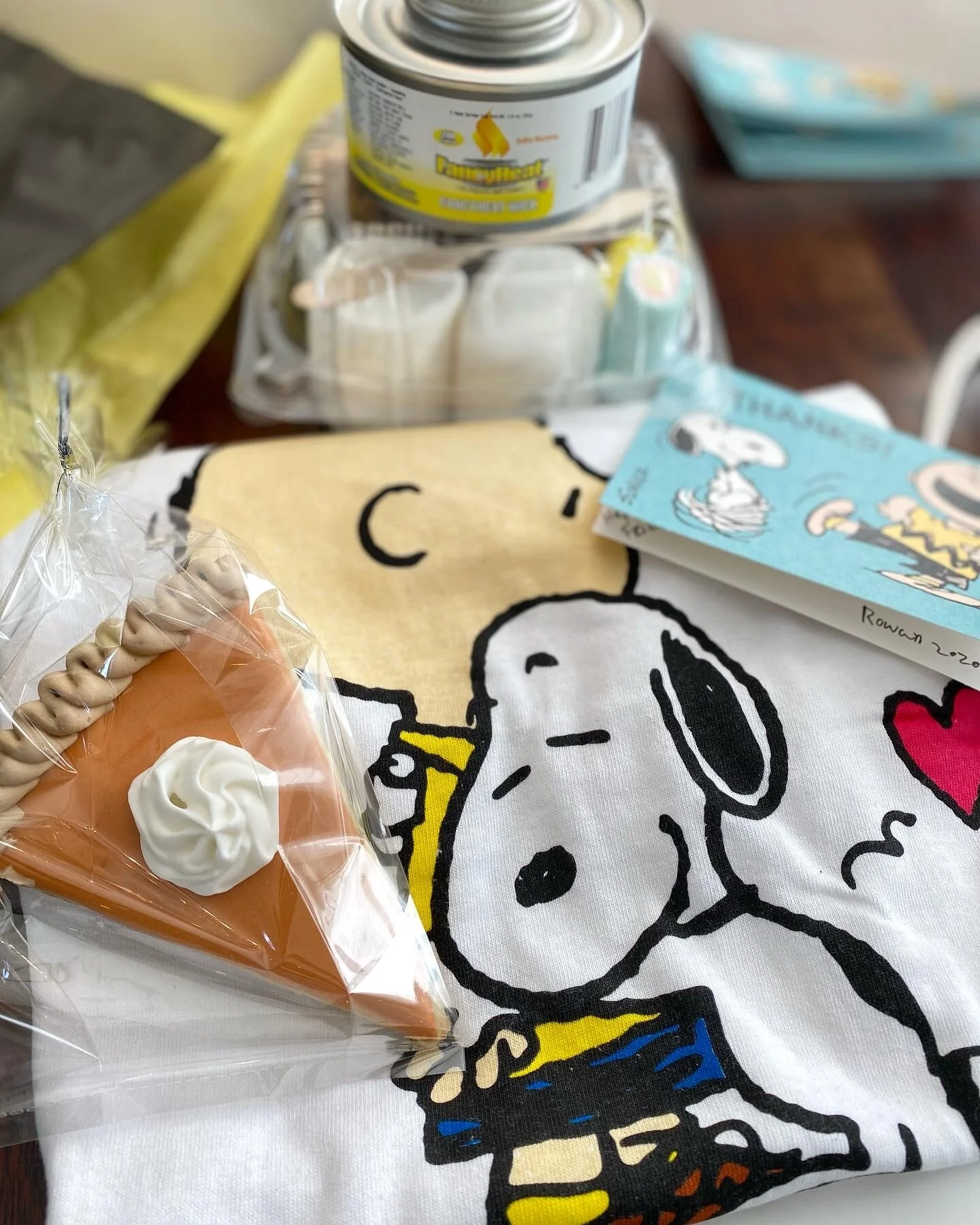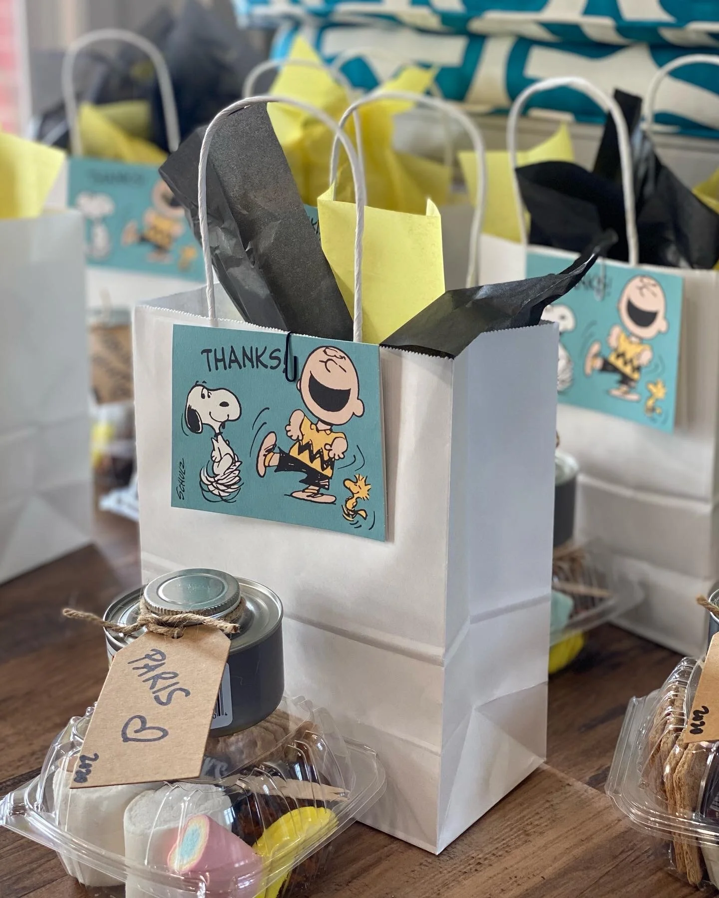 I always have a gift that our guests leave with, in the form of a new experience, art, t-shirt or keepsake. I want everyone to have a memory that they can look back on and smile. This year I went with a individual s’mores kits for each little lady to take home and enjoy. I knew, upon planning, that there would be a potential restriction on guests, so, I wanted to have something fun without having a class or extra people in my home. I also wanted to have a cool thing for the girls to do if we weren’t able to all be together. These kits were perfect. Jeanine, of The Crafty Platter, always delivers on following my vision and creating amazing charcuterie boards, table spreads and delicious eye candy for my guests. I love everything she does. Keeping with the nostalgic Charlie Brown, best friend theme, s’mores and cookies made to look like pumpkin pie slices were perfect combinations. A wonderful lady, here locally, made the beautiful cookies, and as they say, “Friends Always Share Pie,” we had no choice but to share with each girl!