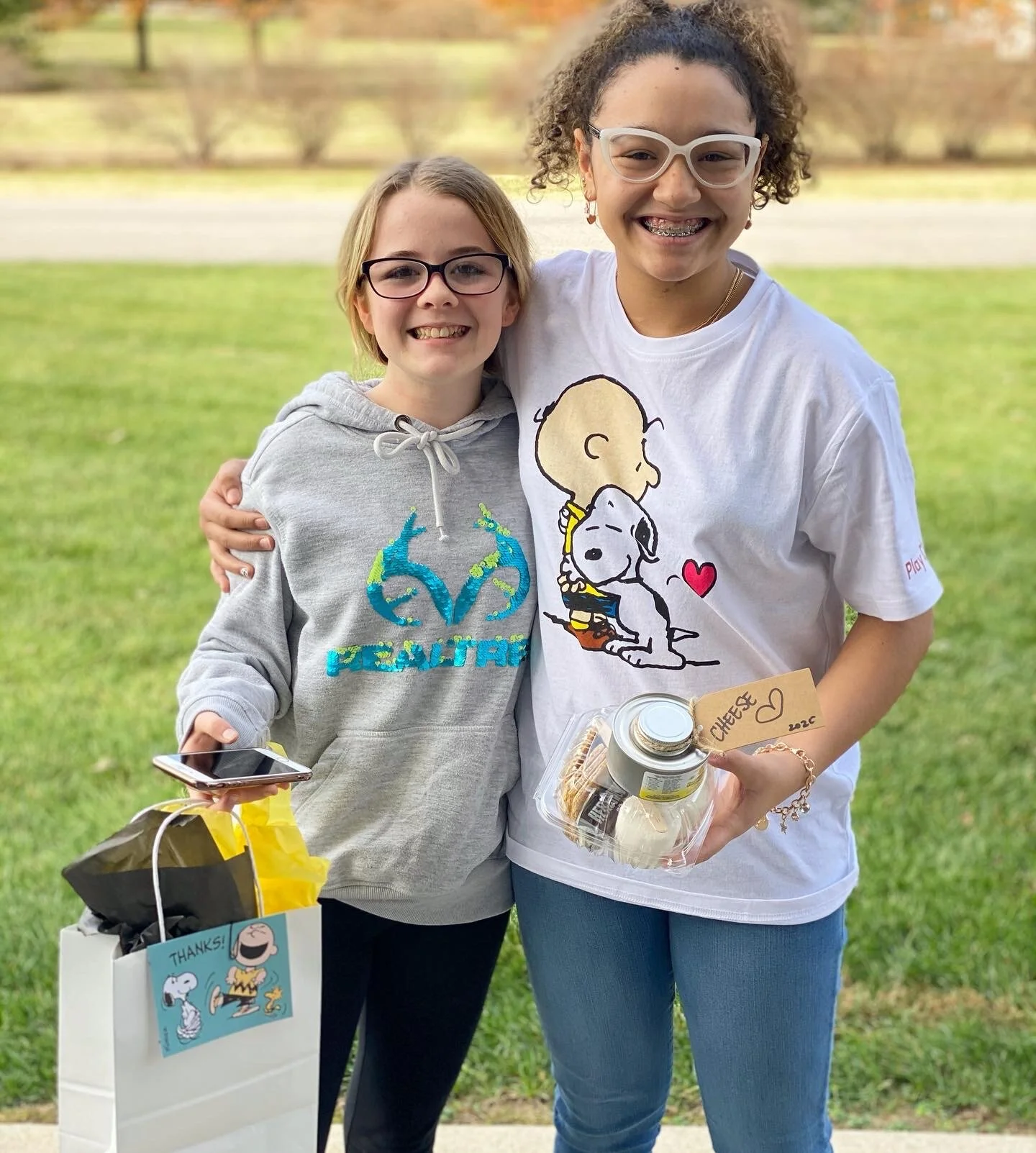 Everything was perfect! Each guest received a cute Charlie Brown Hallmark card with words from my daughter, a scripture (Proverbs 17:17) and a bag with a t-shirt, cookie and s’mores kit. We set up porch pickups and as each person came, the smiles were huge when they saw each other. It was precious. Human interaction is a beautiful thing and as an adult, I forgot how important it was to see your friend in middle school. All the girls’ faces lit up when they saw each other, and after asking permission to get close enough for a picture (it’s still crazy we have to think of that now) we were able to document the moment of Friendsgiving 2020 -The Porch Drop Edition. I would say it was a success. My girl hasn’t stopped smiling and by the text messages I have received from the other Moms, I would say our Friendsgiving was good for their little hearts. I’m so thankful for these times; even during a pandemic.